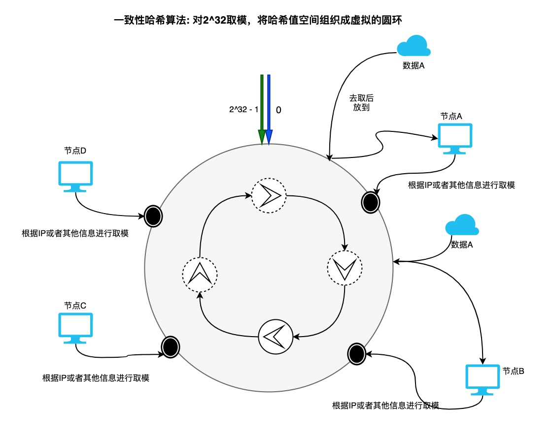 第一种情况:发送雪崩的时候一般是多个节点同时不可用,例如我们的节点服务器内容不足,虽然分主从节点都是存储的数据都是一样的。如果缓存中的数据过大导致节点不可用。那大部分节点也会存在这个问题。请求会大面积的落到数据库层面导致后端系统奔溃。 第二种情况: 首先看一下下图虽然数据根据会根据取模算法分配到不同的节点中,假设节点A不可用,数据A会按照逆时针找到节点B,会因为本来应该存放到节点A的数据存放到节点B,以此类推会导致整个缓存节点不可用。请求也会大面积落到我们后端的数据库层面导致系统奔溃。