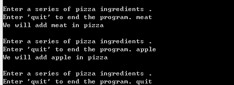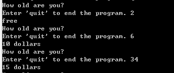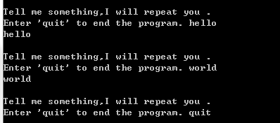 python学习while循环 大石头的笔记 2020-05-20 207 阅读2分钟 #while循环#输出1-5的数n=1while n<=5:print(n)n=n+1#循环停止条件message1="\nTell me something,I will repeat you ."message2="\nEnter 'quit' to end the program. "message = ""while message != 'quit':message = input(message1+message2)if message!='quit':print(message)#:编写一个循环,提示用户输入一系列的比萨配料,并在用户输入'quit' 时结束循环。#每当用户输入一种配料后,都打印一条消息,说我们会在比萨中添加这种配料。message1="\nEnter a series of pizza ingredients ."message2="\nEnter 'quit' to end the program. "message = ""while message != 'quit':message = input(message1+message2)if message!='quit':print("We will add "+message+" in pizza")#电影票 :有家电影院根据观众的年龄收取不同的票价:不到3岁的观众免费;3~12岁的观众为10美元;超过12岁的观众为15美元。请#编写一个循环,在其中询问用户的年龄,并指出其票价。message1="How old are you?"message2="\nEnter 'quit' to end the program. "message = ""while message != 'quit':message = input(message1+message2)if message!='quit':message=int(message)if(message<3):print("free")elif(message>=3 and message<12):print("10 dollars")else:print("15 dollars")#三个出口 :以另一种方式完成练习,在程序中采取如下所有做法。#在while 循环中使用条件测试来结束循环。#使用变量active 来控制循环结束的时机。#使用break 语句在用户输入'quit' 时退出循环。message1="\nEnter a series of pizza ingredients ."message2="\nEnter 'quit' to end the program. "active=Truewhile active:message = input(message1+message2)if message=='quit':breakelse:print("We will add "+message+" in pizza")#编写一个没完没了的循环,并运行它(要结束该循环,可按Ctrl +C,也可关闭显示输出的窗口)x = 1while x <= 5:print(x)不停打印数字1更多免费技术资料可关注:annalin1203