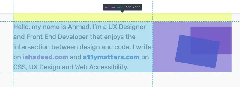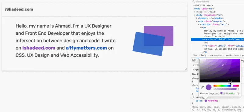 <p>Hello, my name is Ahmad. I’m a UX Designer and Front End Developer that enjoys the intersection between design and code. I write on <a href="www.ishadeed.com" class="link-1">ishadeed.com</a> and <a href="www.a11ymatters.com" class="link-2">a11ymatters.com</a> on CSS, UX Design and Web Accessibility.</p>