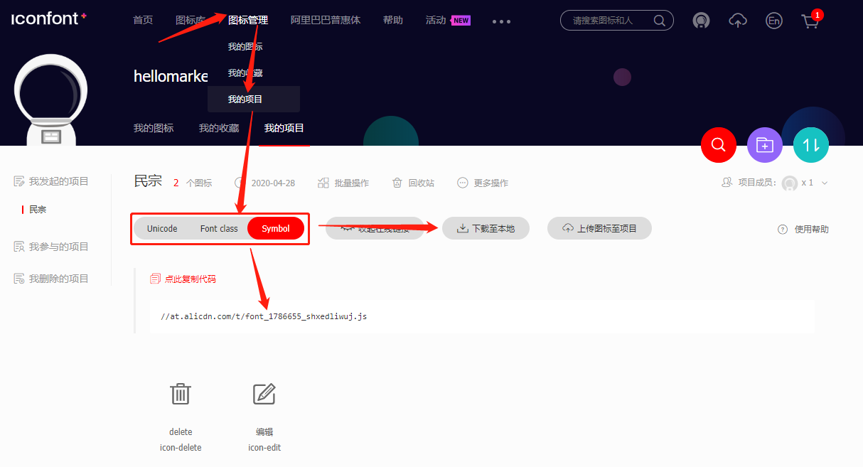 在这里能看到Unicode、Font Class和Symbol三种不同的格式。其中Font Class只是Unicode的优化,本质还是一样的。所以可以简单理解Unicode是兼容格式,适配大多数浏览器但不能变色。Symbol是全新格式,适配现代浏览器,可以像字体一样调样式。