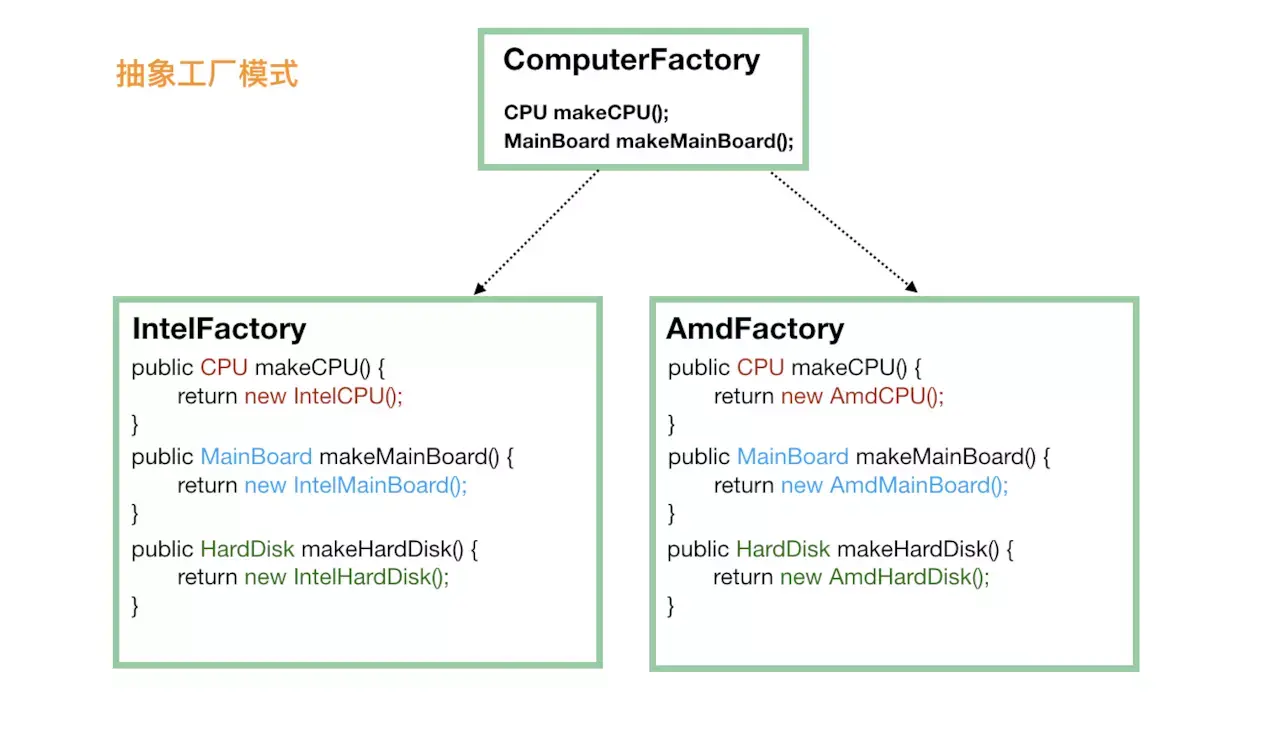当涉及到这种产品族的问题的时候,就需要抽象工厂模式来支持了。我们不再定义 CPU 工厂、主板工厂、硬盘工厂、显示屏工厂等等,我们直接定义电脑工厂,每个电脑工厂负责生产所有的设备,这样能保证肯定不存在兼容问题。