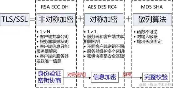 原理 之所以能保证安全,是因为TLS/SSL基于三类算法:散列函数 Hash、对称加密和非对称加密,其利用非对称加密实现身份认证和密钥协商,对称加密算法采用协商的密钥对数据加密,基于散列函数验证信息的完整性。