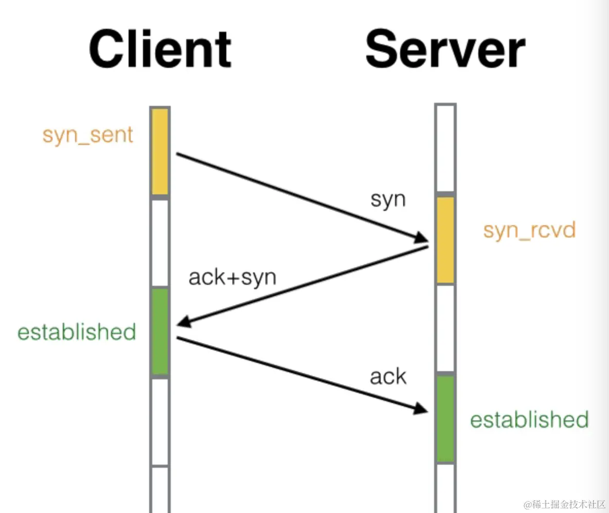 - 李四还有点狐疑,向四周看了一看,有没有可能张三是在看别人呢,他也需要确认一下。所以李四也向张三招了招手(syn),张三看到李四向自己招手后知道对方是在寻求自己的确认,于是也点了点头挤出了微笑(ack),李四看到对方的微笑后确认了张三就是在向自己打招呼(进入established状态)。