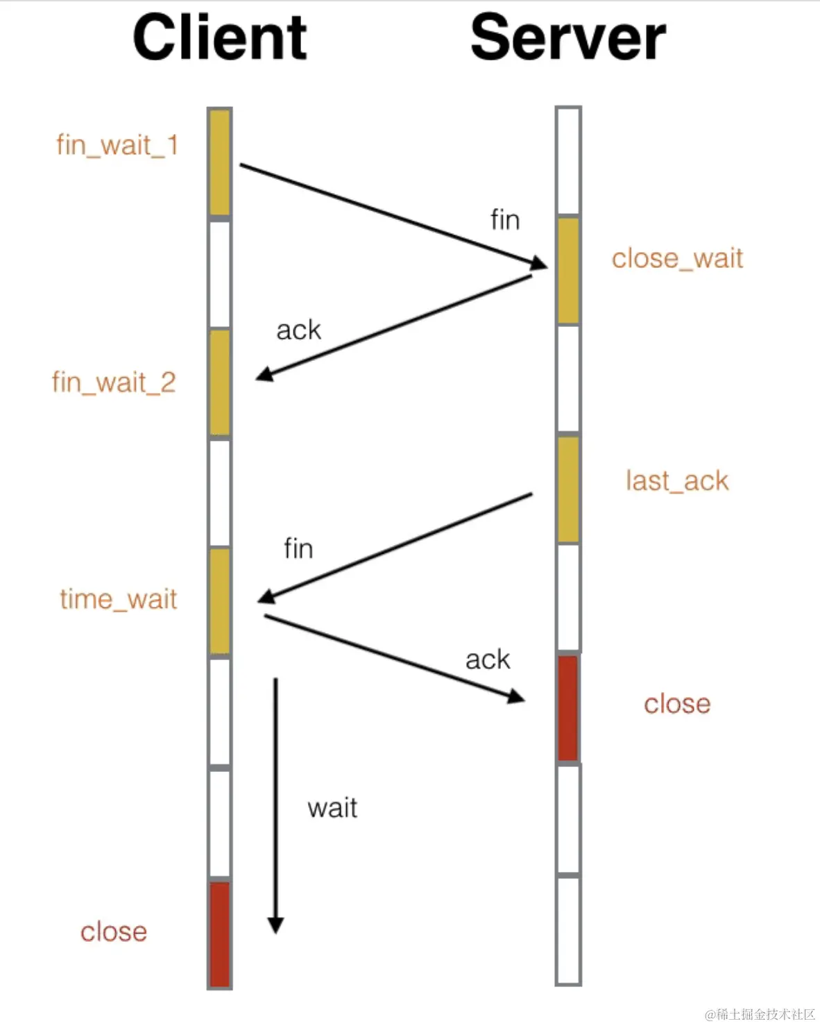 TCP断开链接的过程和建立链接的过程比较类似,只不过中间的两部并不总是会合成一步走,所以它分成了4个动作,张三(客户端)挥手(fin)——李四(服务端)伤感地微笑(ack)——李四挥手(fin)——张三伤感地微笑(ack)。
