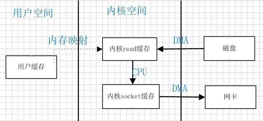使用mmap+write方式代替原来的read+write方式,mmap是一种内存映射文件的方法,即将一个文件或者其它对象映射到进程的地址空间,实现文件磁盘地址和进程虚拟地址空间中一段虚拟地址的一一对映关系;这样就可以省掉原来内核read缓冲区copy数据到用户缓冲区,但是还是需要内核read缓冲区将数据copy到内核socket缓冲区,大致如下图所示: