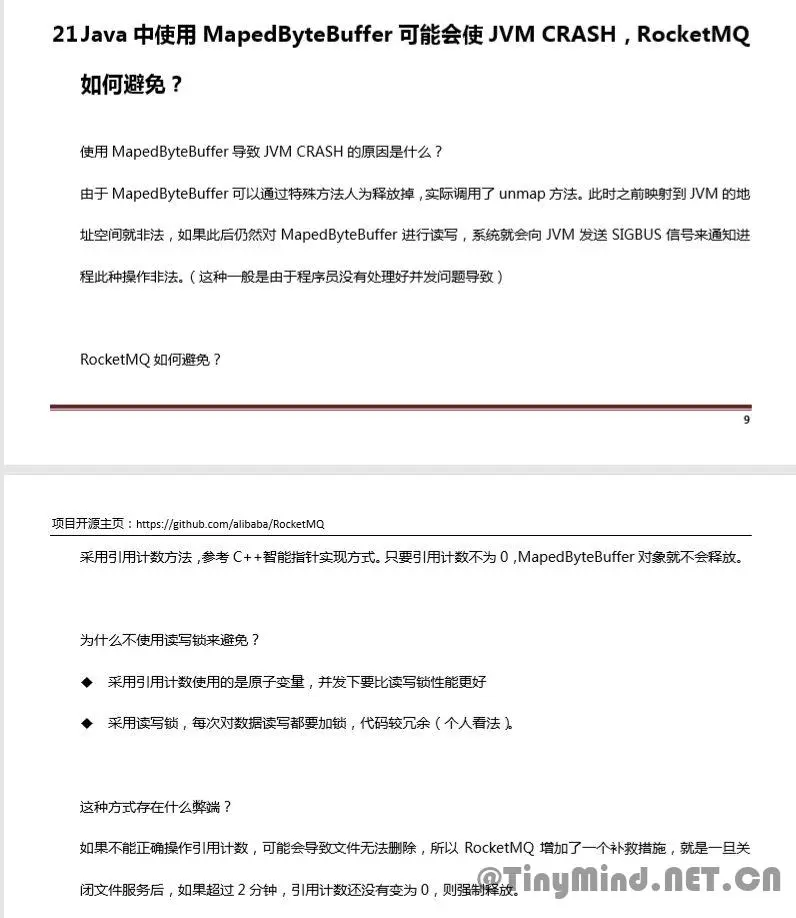 RocketMQ 选择了这种方式,mmap+write 方式,因为有小块数据传输的需求,效果会比 sendfile 更好。但是RocketMQ控制mmap映射的内存分配与释放的地方非常复杂,稍有不慎就会出问题。