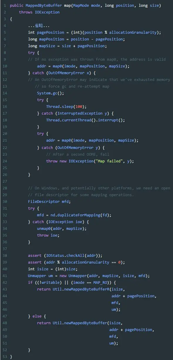 大致意思就是通过native方法获取内存映射的地址,如果失败,手动gc再次映射;最后通过内存映射的地址实例化出MappedByteBuffer,MappedByteBuffer本身是一个抽象类,其实这里真正实例话出来的是DirectByteBuffer;