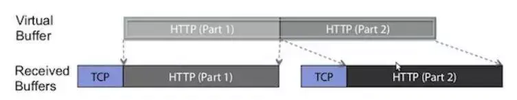 TCP层HTTP报文被分成了两个ChannelBuffer,这两个Buffer对我们上层的逻辑(HTTP处理)是没有意义的。但是两个ChannelBuffer被组合起来,就成为了一个有意义的HTTP报文,这个报文对应的ChannelBuffer,才是能称之为”Message”的东西,这里用到了一个词”Virtual Buffer”。