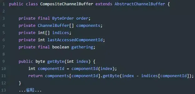 components用来保存的就是所有接收到的buffer,indices记录每个buffer的起始位置,lastAccessedComponentId记录上一次访问的ComponentId;CompositeChannelBuffer并不会开辟新的内存并直接复制所有ChannelBuffer内容,而是直接保存了所有ChannelBuffer的引用,并在子ChannelBuffer里进行读写,实现了零拷贝。