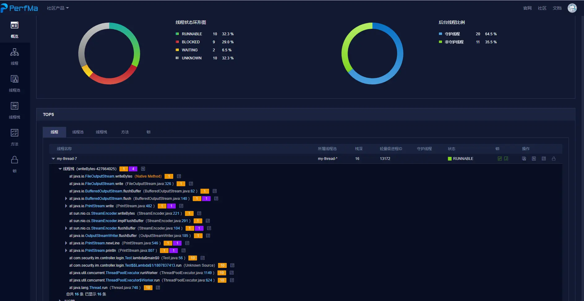 jstack -l pid > ./pid.dump设置成dump文件,可以借助于笨马平台进行线程分析 -