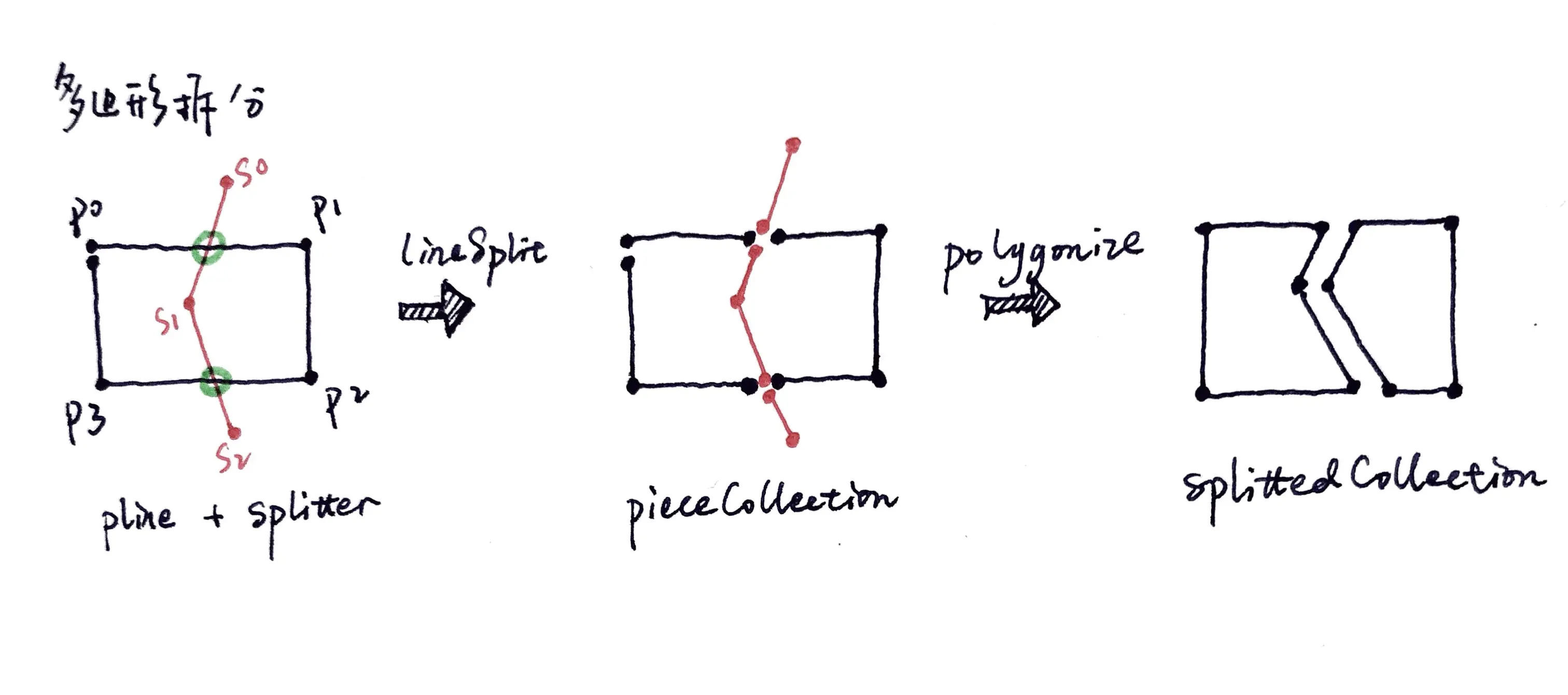 多边形拆分的核心思想是找到切割点,所以线对面的切割可以简化为线对线的切割。两条线互相切割得到子线段,将子线段互相组合形成多边形。