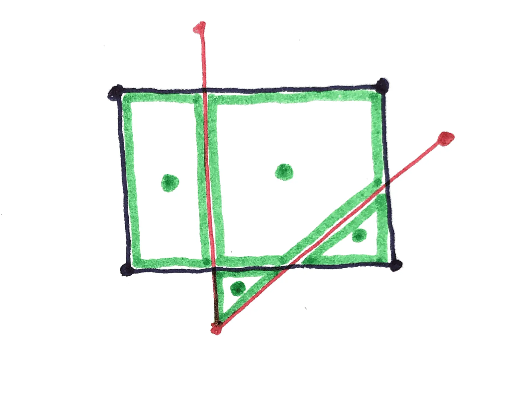 但是多边形的形心就没有这个问题了,在当前的场景下,我们无需判断小多边形的每个顶点是否都落在原多边形内,只要其形心落在原多边形内即可。