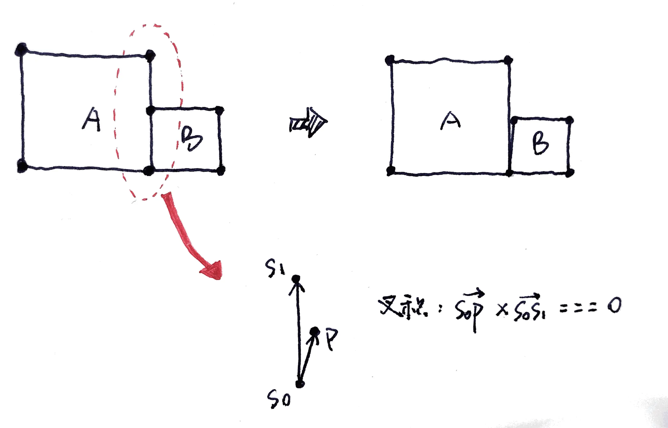 这里先简单介绍一下判断点、线段关系的计算方法,用P表示点,S0和S1两点构成线段,那么首先判断向量P-S0和S1-S0的叉积(叉积表示其构成平行四边形的面积)是否为0,然后判断P是否在S0、S1两点之间。问题就出在叉积是否为0这一步,由于点坐标都是高精度浮点数,叉积很难严格等于0,一般会设定一个较小容限值,只要叉积绝对值小于容限值即可判定为点在线上。