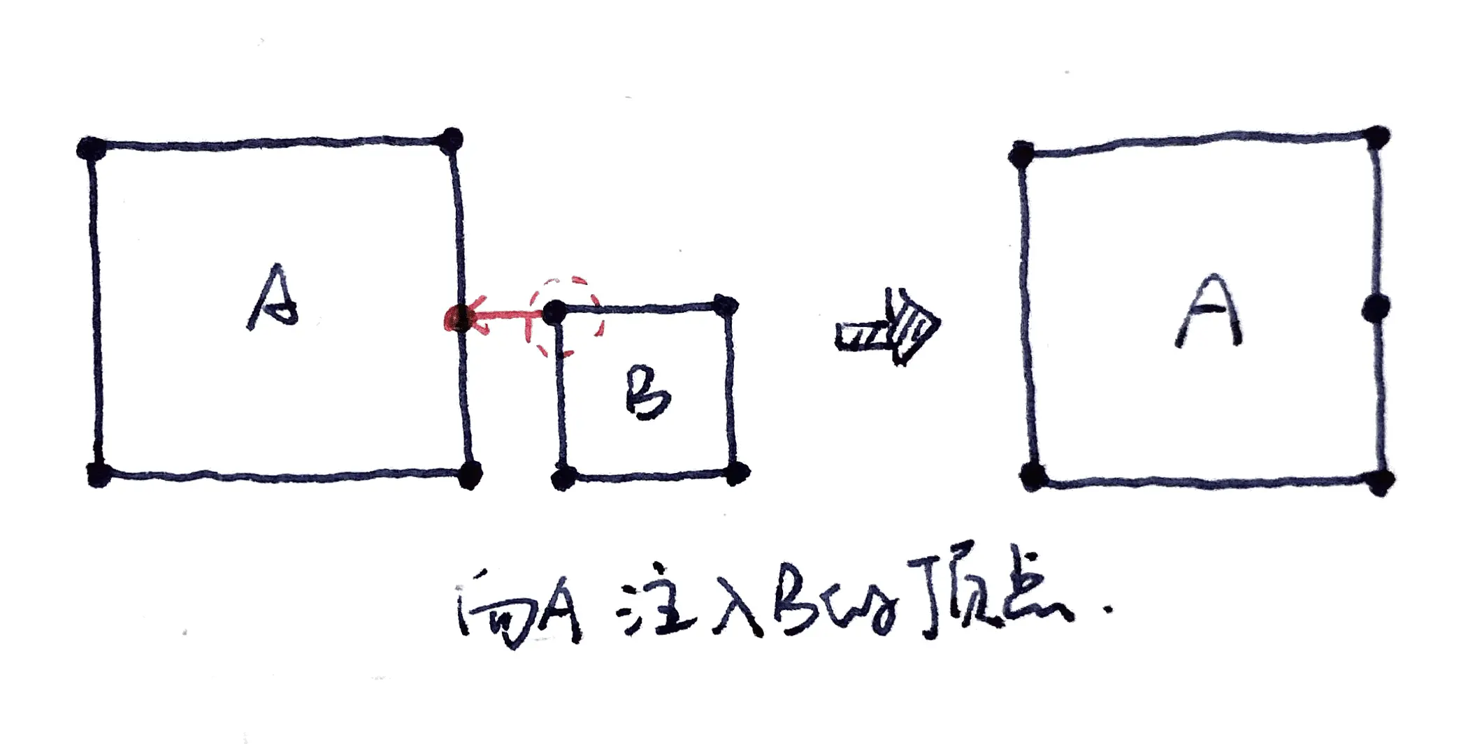已定位合并失败的原因,但是没办法直接修改union的源码,因为Turf在union的实现上其实也使用了外部库martinez-polygon-clipping。不过可以转换思维方式,将部分共边的情况转换为完全共边,再交给union进行合并。这个转换过程我将其称为点注入,将多边形B的顶点注入到多边形A中,即遍历B的顶点进行判断,若其在A的某个线段上且不是线段端头,就将其插入到A的路径中。A与B互相注入顶点之后,所有部分共边的边线都变成完全共边了。