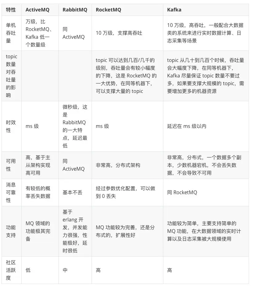 ActiveMQ和RabbitMQ这两着因为吞吐量还有GitHub的社区活跃度的原因,在各大互联网公司都已经基本上绝迹了