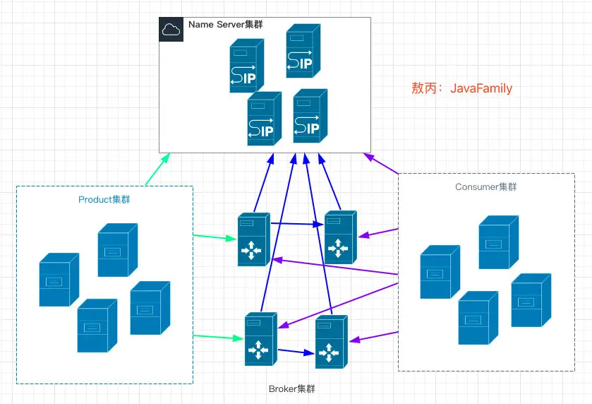 每个 Broker 在启动的时候会到 NameServer 注册,Producer 在发送消息前会根据 Topic 到 NameServer 获取到 Broker 的路由信息,Consumer 也会定时获取 Topic 的路由信息。