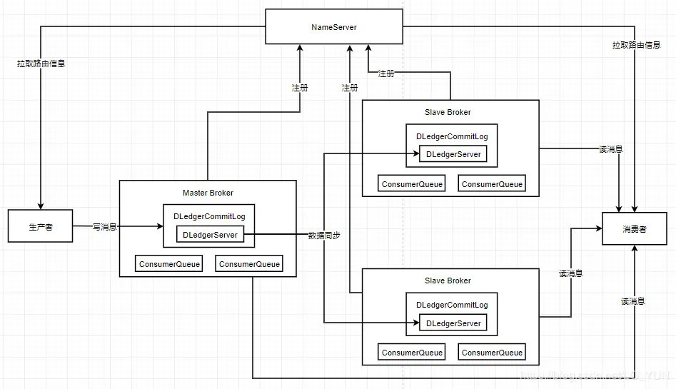 DLedger基于Raft协议进行多副本同步,大致流程为: DLedger多副本数据同步,Leader Broker收到一条消息,通过DledgerServer组件发送一个uncommited消息给Follow Broker的DledgerServer,Follower接收到消息之后发送一个ack确认消息给Leader,多数Follower都确认之后,Leader再发送一个commited消息到Follower上,Follower将接收到的消息置为commited,此时就完成了数据同步。