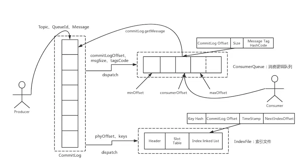 ConsumeQueue(逻辑消费队列)作为消费消息的索引,保存了指定Topic下的队列消息在CommitLog中的起始物理偏移量offset,消息大小size和消息Tag的HashCode值。而IndexFile(索引文件)则只是为了消息查询提供了一种通过key或时间区间来查询消息的方法(ps:这种通过IndexFile来查找消息的方法不影响发送与消费消息的主流程)。