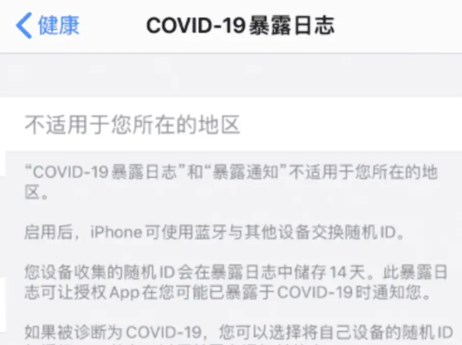 至于 COVID-19 暴露日志,这个在之前的版本还是英文,不过现在它已是汉化版,该功能主要是给第三方应用加入接口,然后我们可以在里面查询日志。
