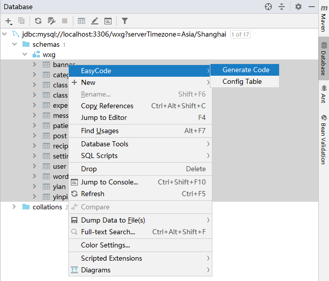 配置完成之后,下面我们就来生成代码,选中需要生成代码的表,然后右键。