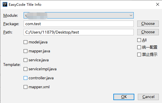 填写好包名、生成的文件路径以及需要生成的代码模板,点击OK就好。