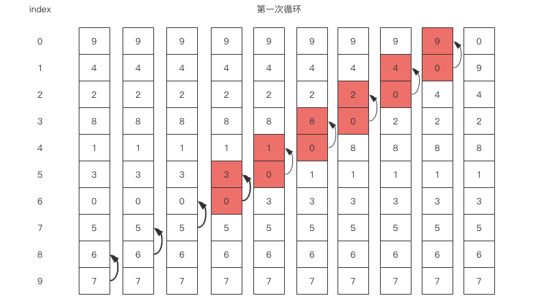//从length-1开始,依次对比相邻的两个元素,小的元素和冒泡一样,进行上移。