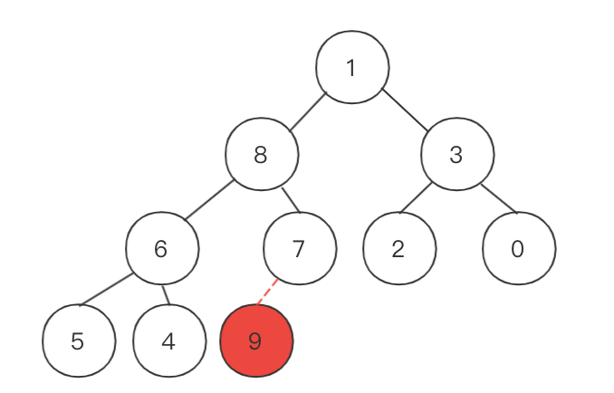 1之外,其他的都满足大顶堆。顶点9我们认为已经排好序了,可以先忽略。因为其他的顶点都满足大顶堆,因此我们只需要确认