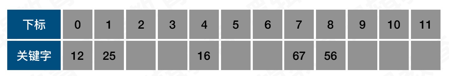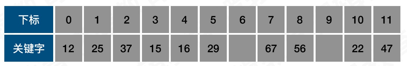 关键字集合 { 12,67,56,16,25,37,22,29,15,47,48,34 } 表⻓为12, 我们⽤散列函数f ( key ) = key mod 12;