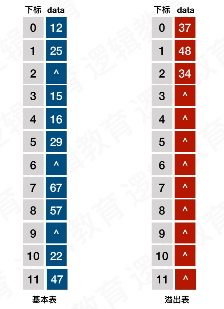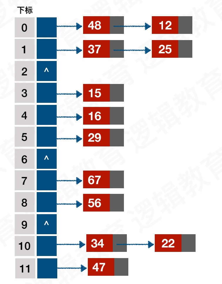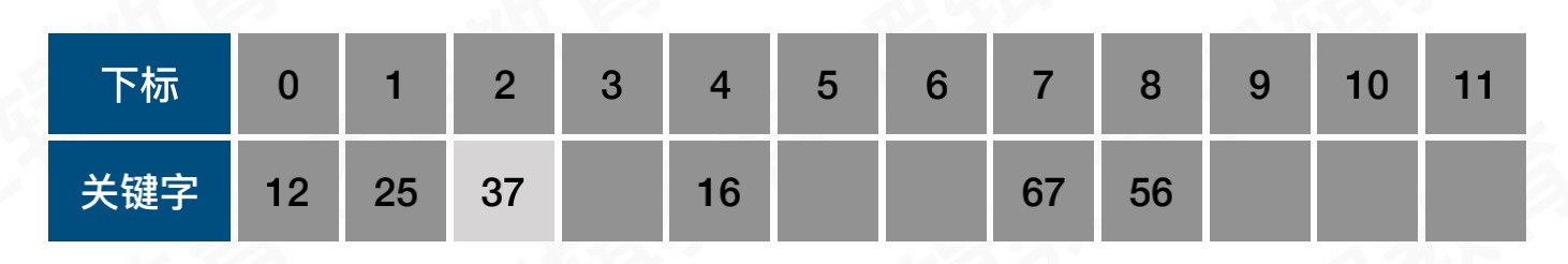 - key=37,f(37)=1,与25冲突;使用开放地址公式f(37)=(f(37)+1)mod 12 = 2;下标2位置上是空,存储下来