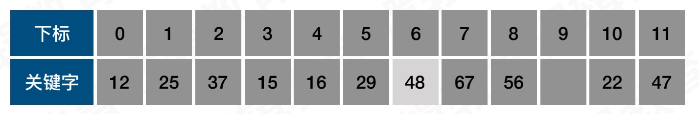 - f(48) = 48 mod 12 = 0;此时0的位置上已经存储了数据12.那么12和48就是同义词了。使用开放地址法f(48)=(f(48)+2)mod 12=1;与25冲突。继续往下使用开放地址发f(48)=(f(48)+6)mod 12=6时。此时6位置上没有数据,则48存储到6的位置上。