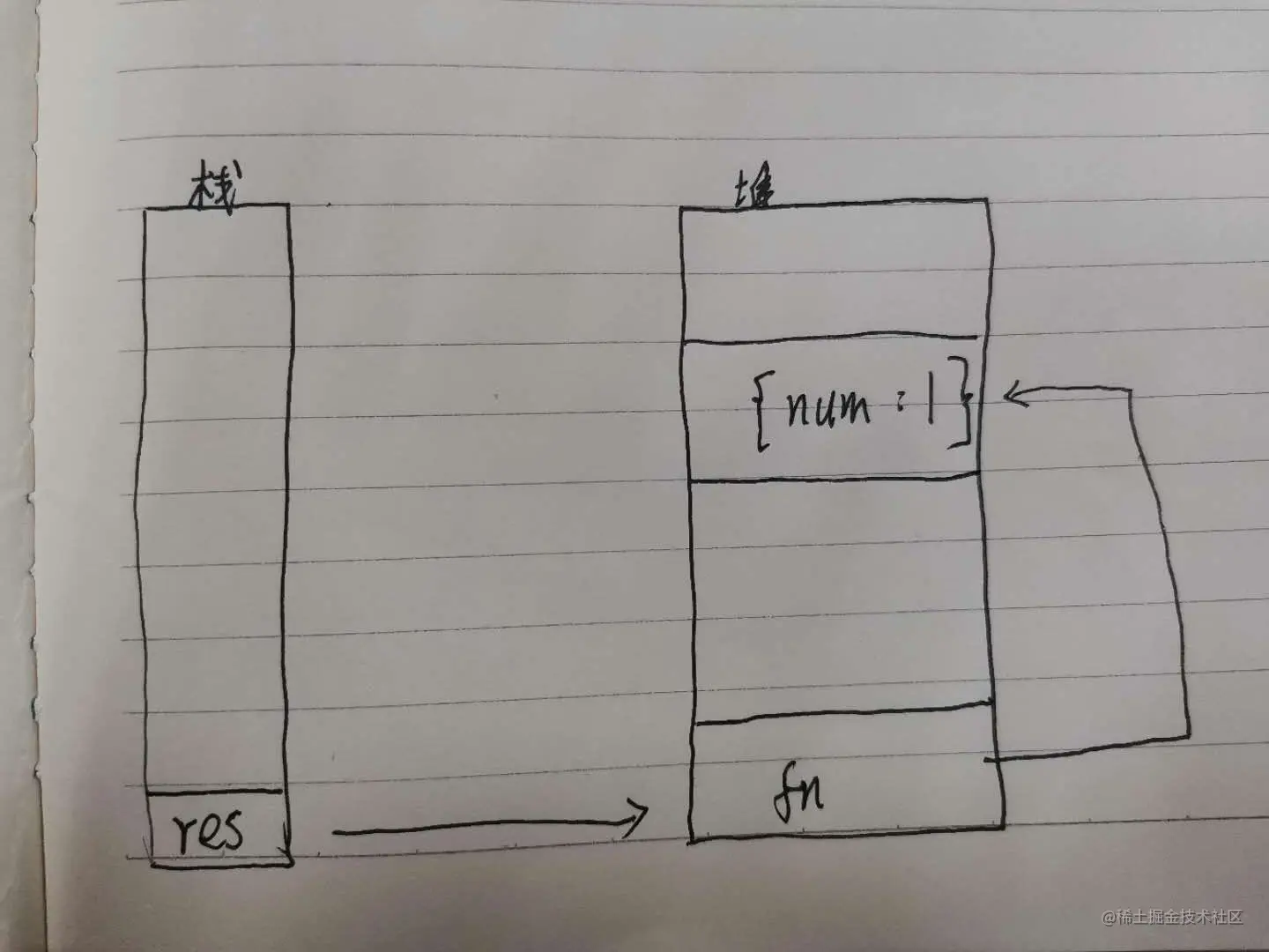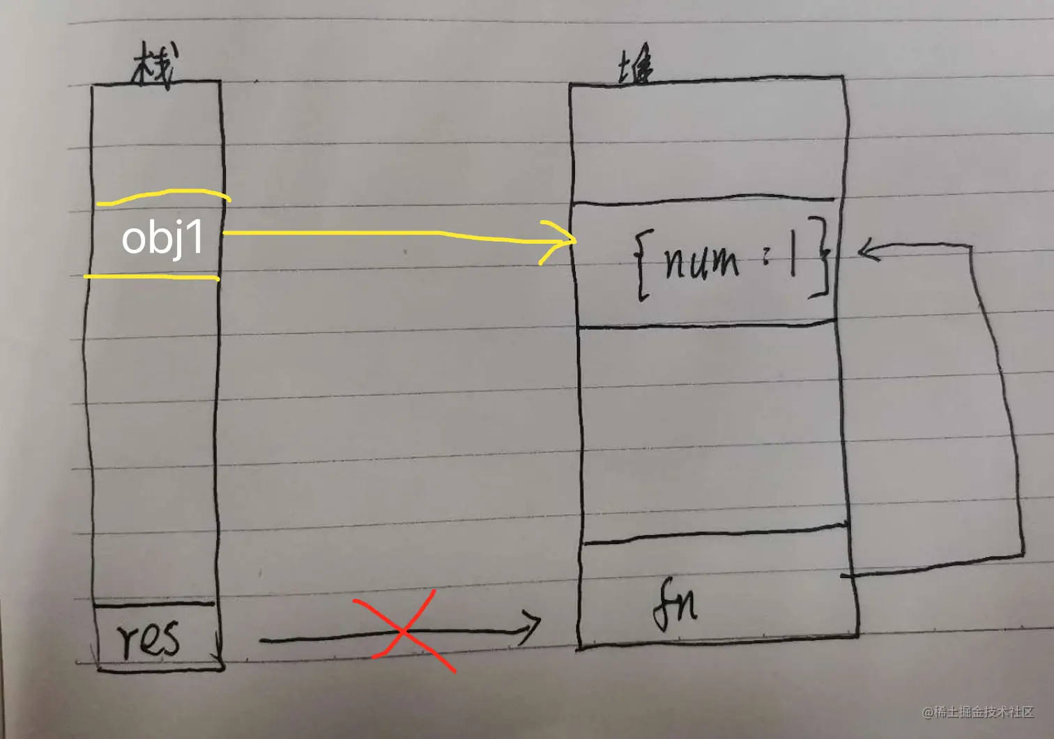 全局变量res(这个可以看作根部,因为res位于window对象中)接受到incre函数返回的匿名函数这里叫他fn(fn就是个函数对象,保存在堆内),同时fn中obj1变量又指向 * {num :1} 这个对象,于是就形成了一条链路, res=>fn=> {num :1},按照上面对标记清除的定义, {num :1}是可以从根部(res)到达的,那么{num :1}就会被标记为活跃对象,不会被当做垃圾回收。*