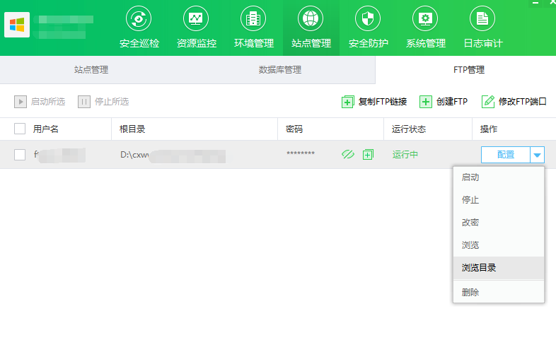 ftp管理,选择创建的ftp账号,点击浏览目录