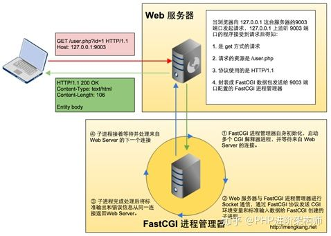 FastCGI 与传统 CGI 模式的区别之一则是 Web 服务器不是直接执行 CGI 程序了,而是通过 socket 与 FastCGI 响应器(FastCGI 进程管理器)进行交互,Web 服务器需要将 CGI 接口数据封装在遵循 FastCGI 协议包中发送给 FastCGI 响应器程序。正是由于 FastCGI 进程管理器是基于 socket 通信的,所以也是分布式的,Web服务器和CGI响应器服务器分开部署。