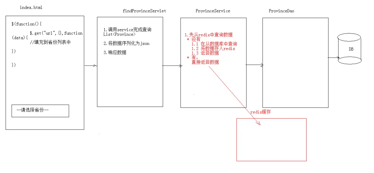 1.没有-->再冲数据库中查询 (Dao)--->再将数据存到redis中--->返回数据