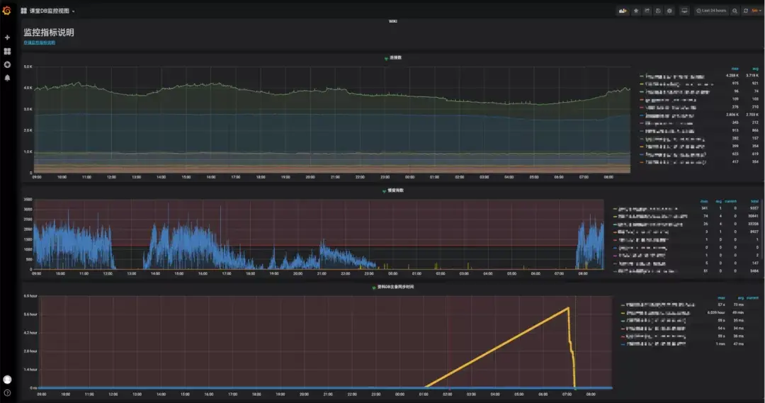 常用的关注指标有连接数、内存使用率、CPU使用率、主备同步、慢查询数等,结合质量看板的数据层监控,能全面掌握数据层运行状态。