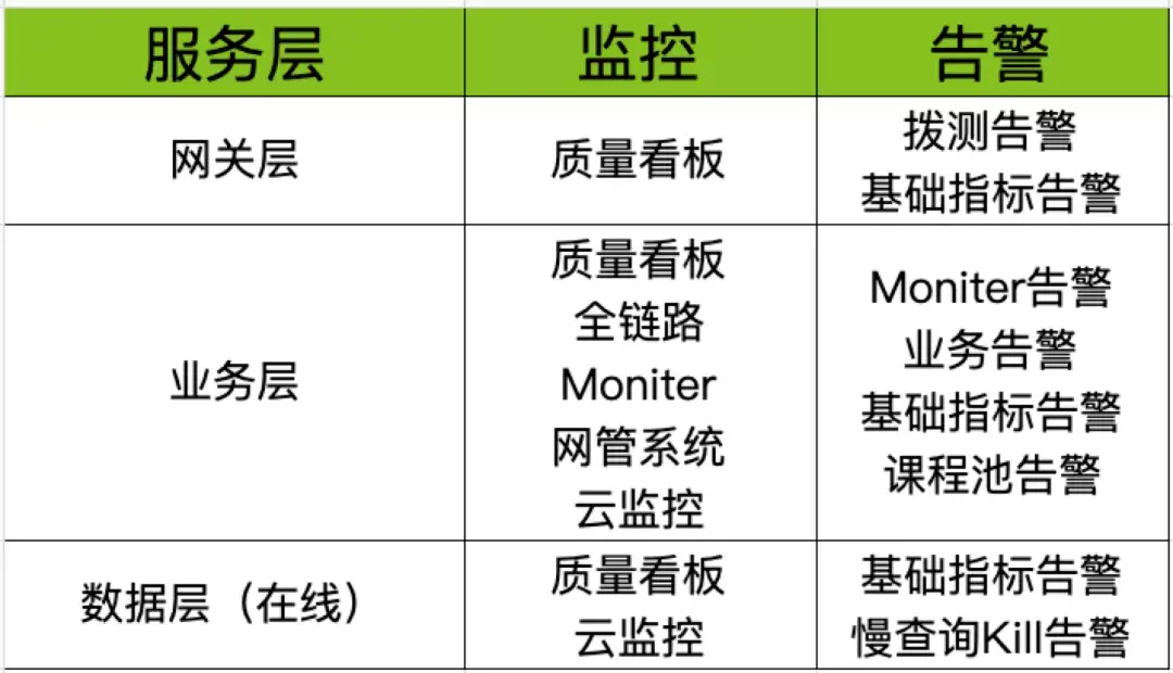 不同模块层的领域知识和模型不同,故监控的指标会有所差异,应用层会关注成功率、请求量、失败明细等核心指标,而在线数据会关注连接数、慢查询数、主从同步时间、CPU负载等。