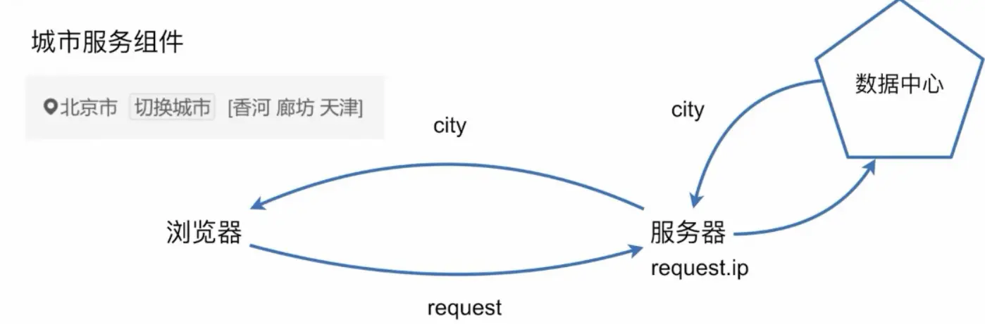 浏览器在发出请求的时候,会有一个 request ,在服务器端可以拿到 requset.ip,然后就可以取数据中心作映射,根据 ip 来定位城市,服务器拿到 city后再下发给浏览器。