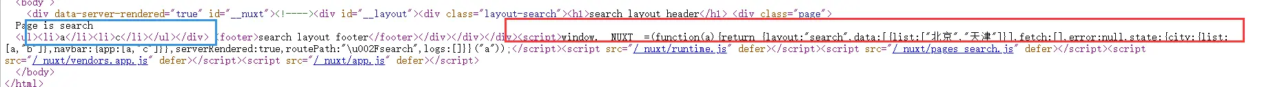 项目搭建完成后,我们随便写点东西,然后打开打开源码,就会有惊奇的发现。服务器端渲染完页面后给浏览器端的html分了几个部分,第一个是样式 style,第二个是模板内容,例如上图中圈中的蓝色部分,第三个是服务端拿到的数据结果,例如上图中圈中的红色部分,为什么服务端拿到的数据给到浏览器端呢?