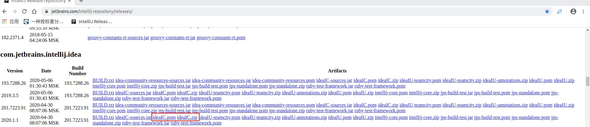 - 在 www.jetbrains.com/intellij-re… 下查找你需要的依赖文件。例如,我要找的版本是 ideaIC-2020.1.1 ,所以我需要下载 ideaIC.pom,ideaIC.zip两个文件(页面较长,可以直接搜索“com.jetbrains.intellij.idea”快速跳转)。