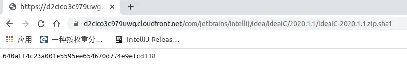 - 查找 ideaIC-2020.1.1.zip.sha1文件的内容 ,地址为 d2cico3c979uwg.cloudfront.net/com/jetbrai…。打开之后是一个页面,内容是一行字符,如图: