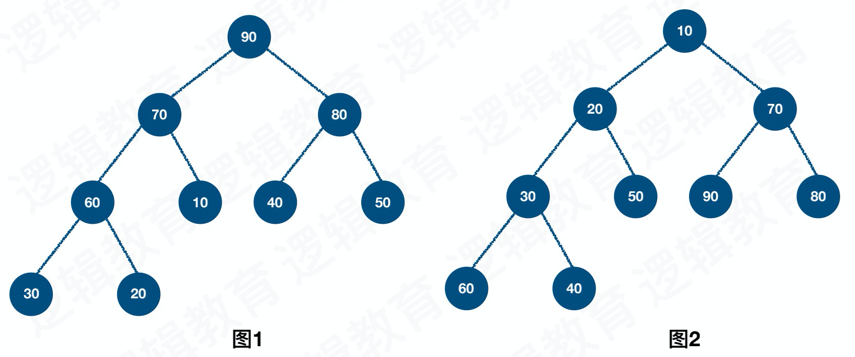 堆是具有下⾯性质的完全⼆叉树:每个结点的值都⼤于或等于其左右孩⼦结点的值,称为⼤顶堆;如图1;或者每个结点的值都⼩于等于其左右孩⼦的结点的值,称为⼩顶堆,如图2.