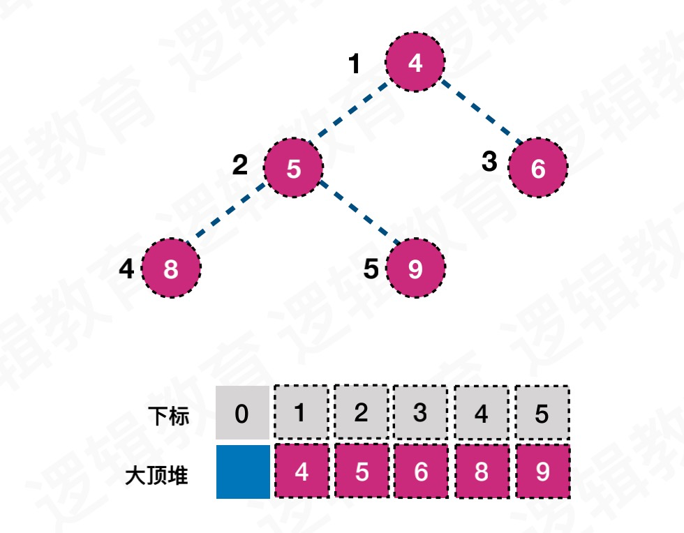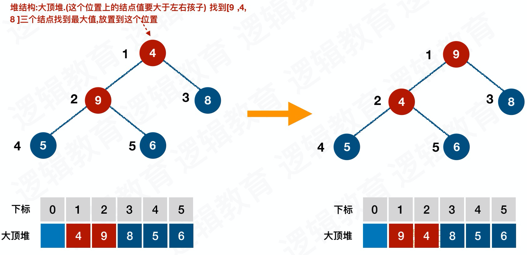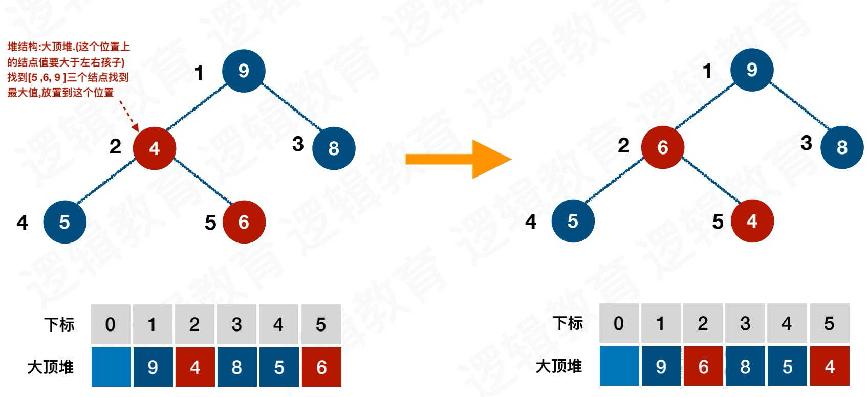- 将待排序的序列构成⼀个⼤顶堆,此时,整个序列的最⼤值就堆顶的根结点,将它移⾛(其实就是将其与堆数组的末尾元素交换, 此时末尾元素就是最⼤值);