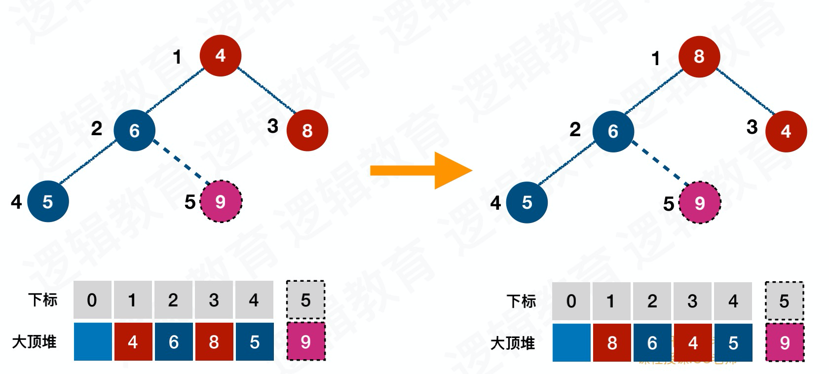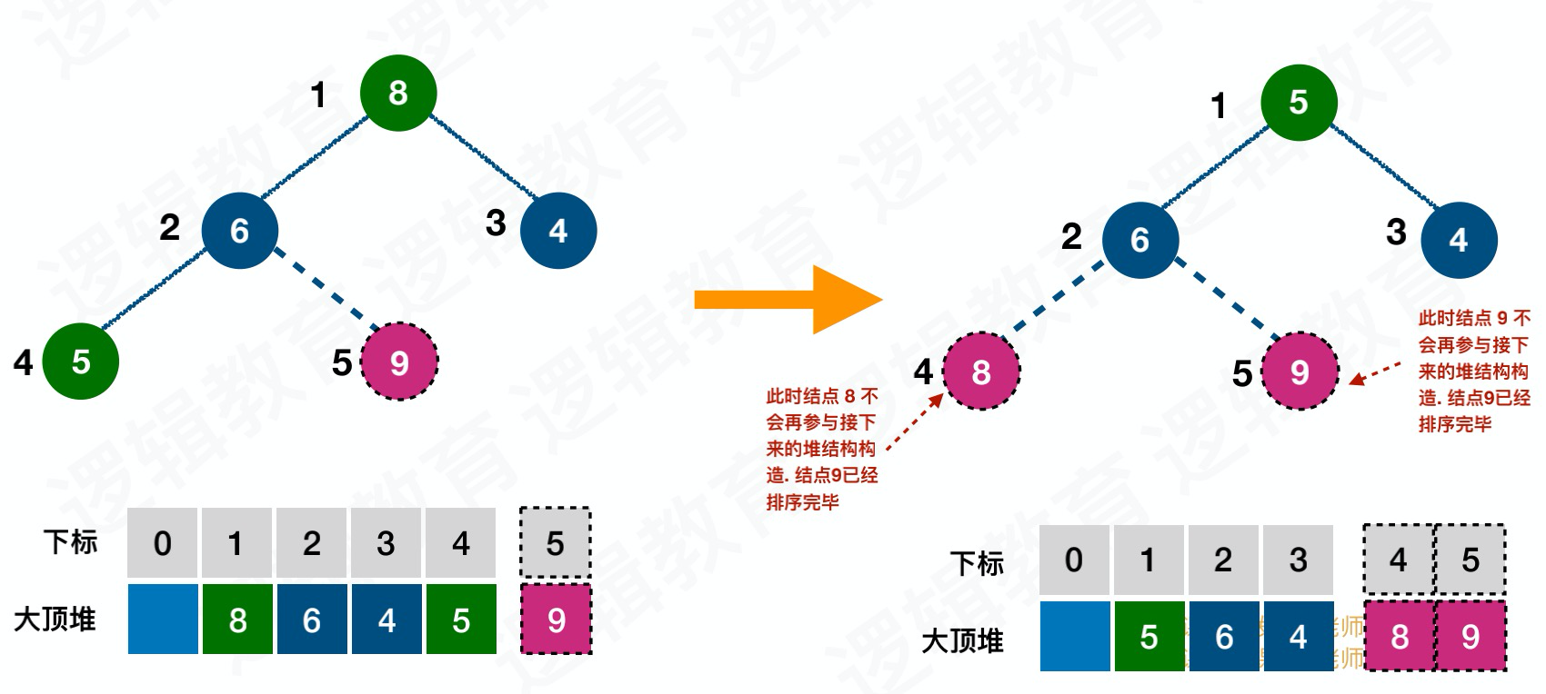 - 将堆顶元素与末尾元素交换,将最⼤元素“沉”到数组末端;