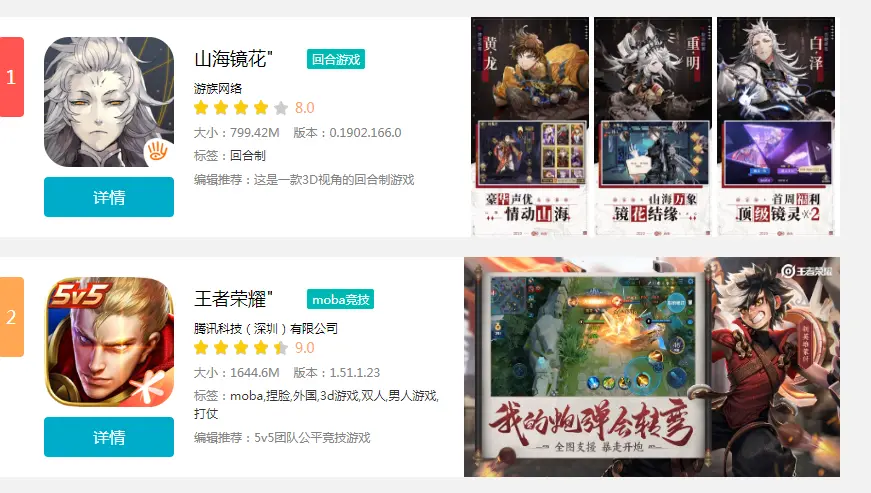 .rank_left ul{ overflow: hidden; }.rank_left ul li{ height:220px; margin-bottom:20px; overflow: hidden; background:#FFF; }.rank_left ul li > i{ float: left; width: 26px; height: 80px; margin: 20px 0 0 -2px; color: #fff; text-align: center; line-height: 80px; font-size: 18px; border-radius: 4px; background: #d2d2d2; }.rank_left ul li .icon1{ background:#ff5550; }.rank_left ul li .icon2{ background:#ffa753; }.rank_left ul li .icon3{ background:#ffe160; }.rank_left ul li .gameContent{ float:left; width:430px; height:220px; padding:20px 0 20px 20px; overflow: hidden; }.rank_left ul li .gameContent .l{ float: left; width:130px; overflow: hidden; }.rank_left ul li .gameContent .l > a{ float:left; display:block; width: 130px; }.rank_left ul li .gameContent .l > .game_img{ height: 130px; overflow: hidden; border-radius: 25px; }.rank_left ul li .gameContent .l > .game_img img{ display:block; width:130px; height:130px; }.rank_left ul li .gameContent .l > .details{ height: 40px; text-align: center; line-height: 40px; font-size: 16px; color: #fff; margin: 10px 0 0; border-radius: 4px; background: #00abcb; }.rank_left ul li .gameContent .r{ float:left; max-width:255px; margin-left:20px; }.rank_left ul li .gameContent .r .r_name{ margin:10px 0; overflow: hidden; }.rank_left ul li .gameContent .r .r_name .r_na{ float: left; font-size: 18px; width:108px; height: 26px; line-height: 26px; margin:-2px 5px 0 0; word-break: break-all; overflow: hidden; white-space: nowrap; text-overflow: ellipsis; }.rank_left ul li .gameContent .r .r_name .r_type{ float:left; color: #fff; background: #00bab3; height: 20px; line-height: 20px; padding: 0 5px; margin: 2px 5px 2px 0; border-radius: 2px; font-size: 12px; }.rank_left ul li .gameContent .r .company{ font-size:12px; display:block; height:14px; line-height:14px; margin-bottom:5px; } .rank_left ul li .gameContent .r .company:hover{ color:#00b59f; }.rank_left ul li .gameContent .r .score{ height:18px; overflow: hidden; }.rank_left ul li .gameContent .r .score .stars{ display:block; float:left; position: relative; width:96px; height:16px; background:url(../img/star.png) no-repeat; background-position: 0px -17px; margin-right:5px; }.rank_left ul li .gameContent .r .score .stars i{ display:block; width:80%; height:16px; background:url(../img/star.png) no-repeat; position: absolute; top:0px; left:0px; }.rank_left ul li .gameContent .r .score .score_text{ float:left; font-size:14px; color:#ffa75b; height:16px; line-height:16px; }.rank_left ul li .gameContent .r .type{ height:18px; color:#838383; margin-top:5px; }.rank_left ul li .gameContent .r .type span{ padding-right:10px; }.rank_left ul li .gameContent .r .tags{ color:#838383; margin-top:5px; }.rank_left ul li .gameContent .r .tags a{ line-height:18px; color:#333; }.rank_left ul li .gameContent .r .editor{ display:block; height:20px; line-height:20px; margin-top:5px; color:#838383; word-break: break-all; overflow: hidden; white-space: nowrap; text-overflow: ellipsis; }.rank_left ul li .multi{ width:376px; }.rank_left ul li .multi .rank_img{ display:block; width:118px; min-height:220px; margin-right:5px; }.rank_left ul li .multi .rank_img img{ display:block; width:118px; min-height: 220px; }.rank_left ul li .screen{ width:376px; }.rank_left ul li .screen .rank_img{ display:block; width:376px; height:220px; overflow: hidden; }.rank_left ul li .screen .rank_img img{ display:block; width:376px; min-height:220px; }最终的效果就是如上喽。