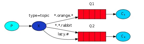 如下图,对于routingKey为quick.orange.rabbit、lazy.orange.elephant、quick.orange.fox、lazy.brown.fox、lazy.pink.rabbit,Q1可以收到前3个routingKey的消息,Q2可以收到第1、2、4、5个routingKey的消息。