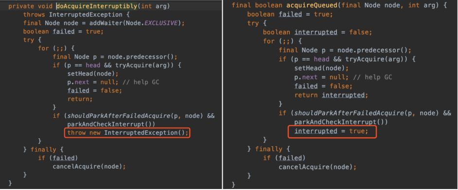 这个方法的逻辑和 acquire() 方法差不多,最大的不同就是 acquire() 方法仅是对中断做了标志,而acquireInterruptibly() 方法在发生中断时会抛出异常,如下: