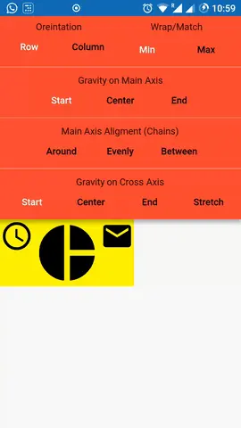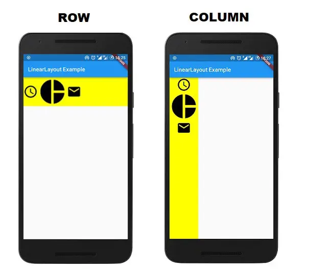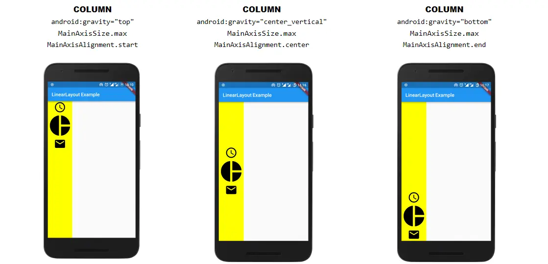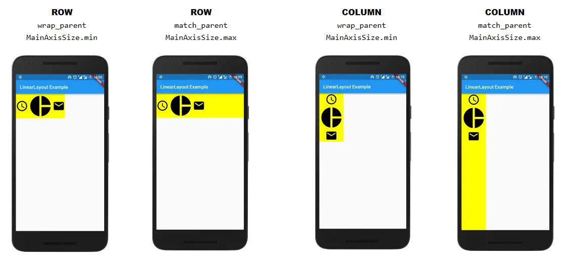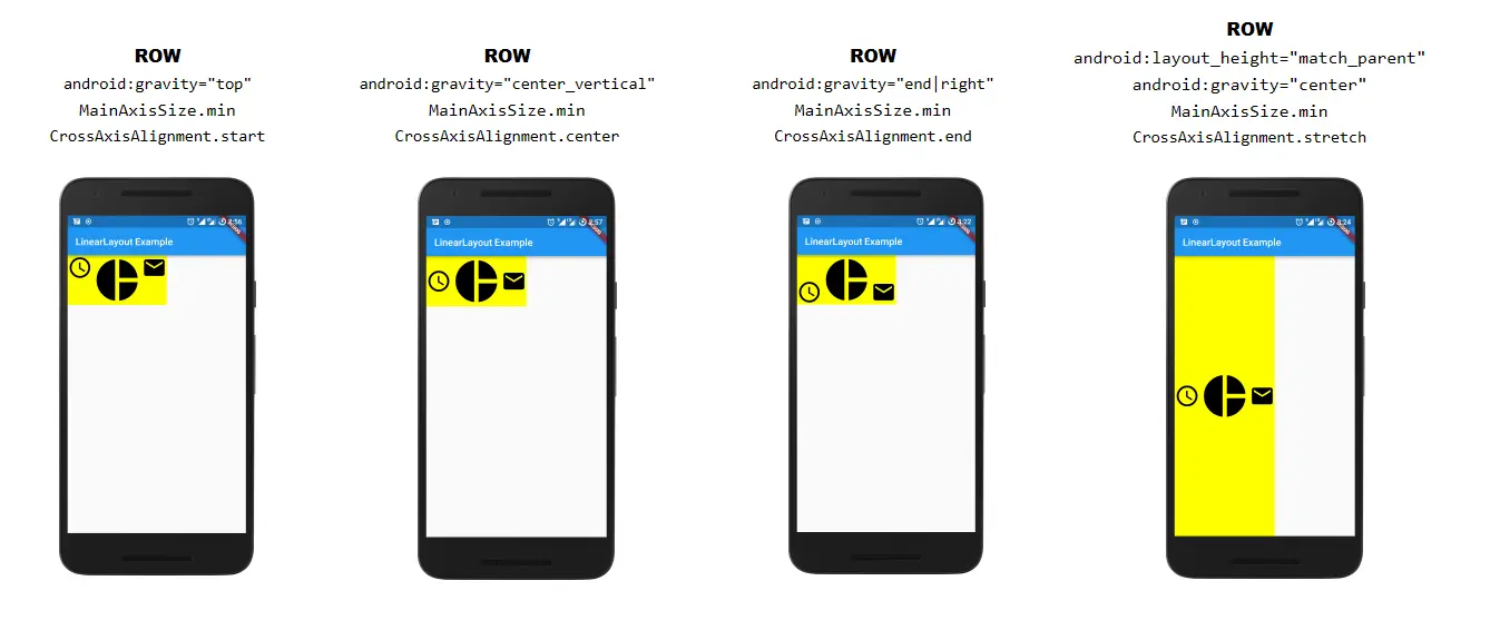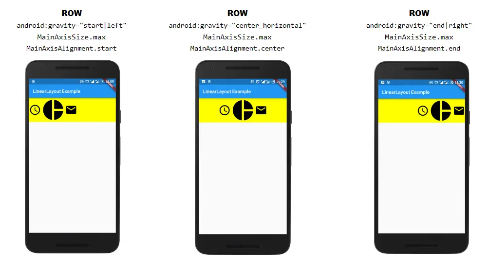 下面的输出比较了 LinearLayout 的属性和 Row 的MainAxisAlignment属性。