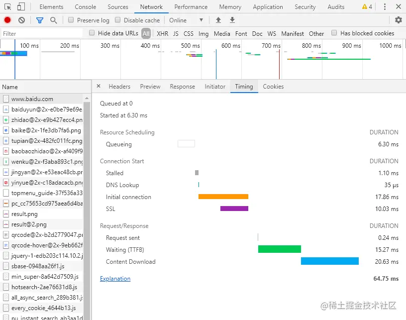从这个例子可以看出,真正下载数据的时间占比为 13.05 / 204.16 = 6.39%,文件越小,这个比例越小,文件越大,比例就越高。这就是为什么要建议将多个小文件合并为一个大文件,从而减少 HTTP 请求次数的原因。