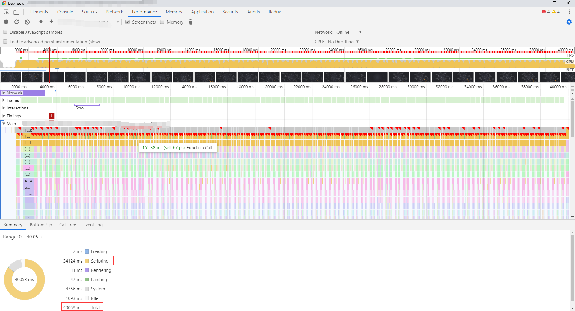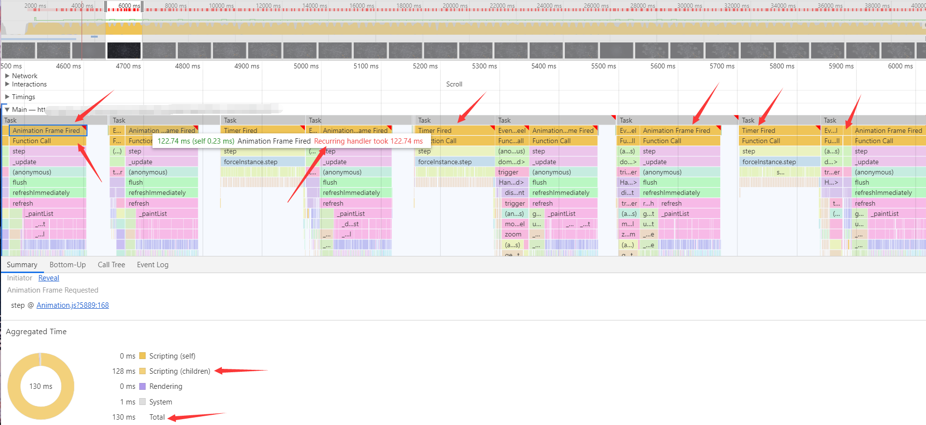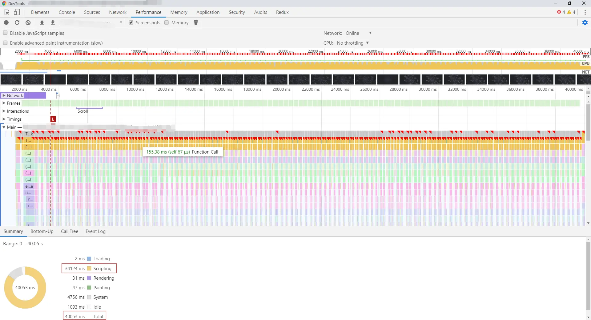 卧槽,花费了 40s,可以,用户不拿刀砍我,我都谢天谢地了,我们任意挑一秒钟看一看一个具体的 Task,发现都是 Animation Frame Fired 和 Function Call 搞的鬼