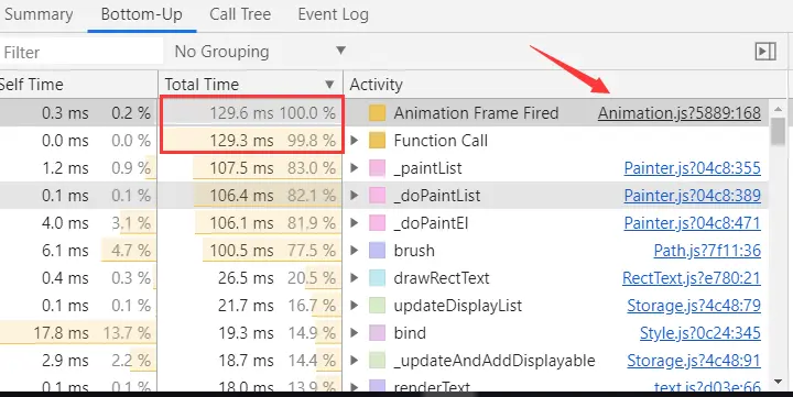 总共就 130s,JS 你占了 128s,点击 Bottom-Up,进去看一看到底是什么妖魔鬼怪